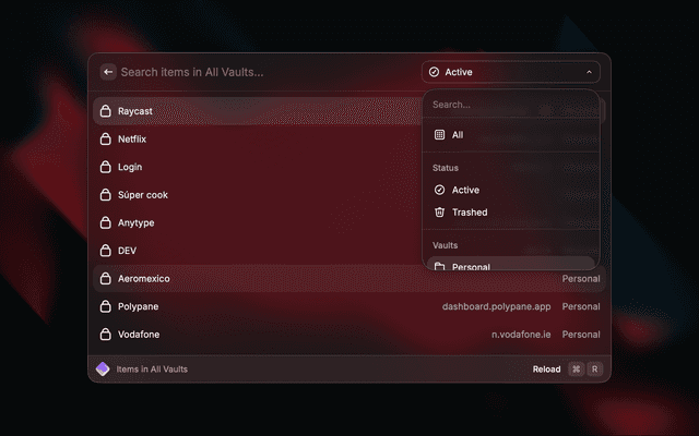 - Supports different item types: you can copy fields from various item types (e.g., login, password, credit card, identity) directly from Raycast