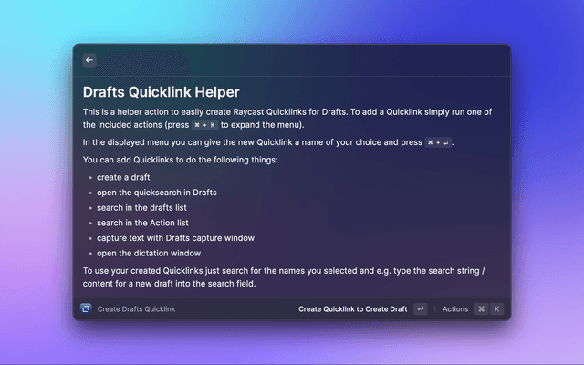 Create a Raycast Quicklink to open a Draft by passing a title and the UUID of the Draft.