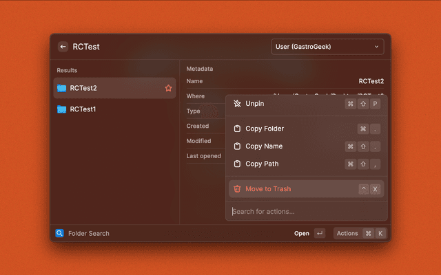 /)/path/to/plugins and /path/to/plugins/ work)/Users/<username>/Library/Application Support/Raycast/extensions/folder-search/plugins//path/to/your/folder-search/plugins/⌘ + ⌥ + ↑ - Navigate to enclosing folder⌘ + ⌥ + ↓ - Enter selected folder⌘ + . - Copy folder⌘ + ⇧ + . - Copy folder name⌘ + ⇧ + , - Copy folder path⌘ + ⇧ + L - Create quicklink⌘ + ⇧ + P - Toggle pin status⌘ + ⇧ + D - Toggle details view⌘ + ⇧ + S - Move Finder selection to folder⌘ + O - Open with...⌃ + X - Move to Trash