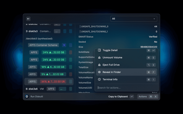 diskutil info -plist which shows more information including SMART dataIt does not support disk formatting, partitioning, or other destructive write actions. However, it is easy to select a disk and switch to the terminal via CMD+T for manual diskutil commands.