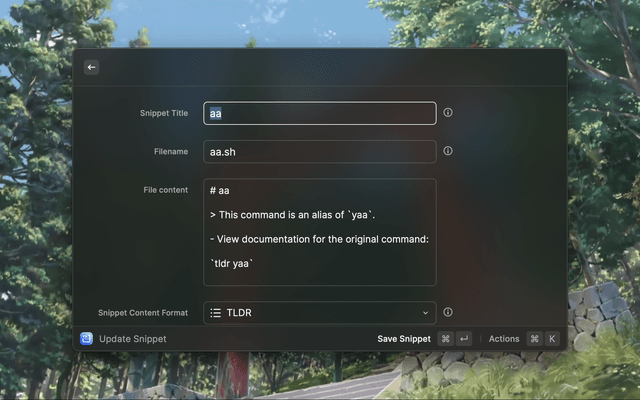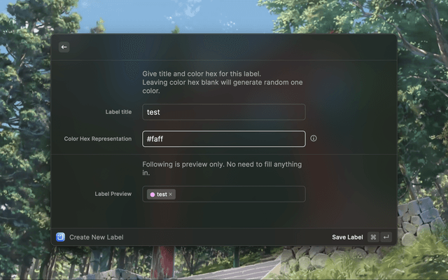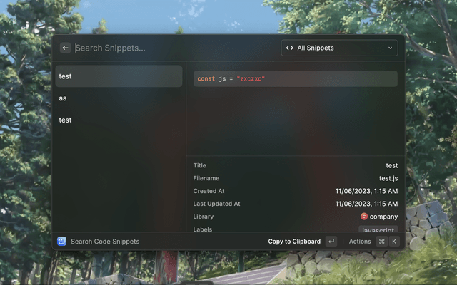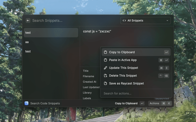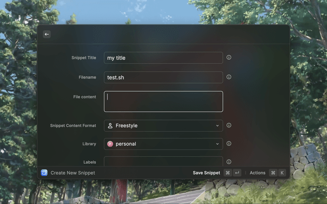 Open raycast - Create Code Snippet - Cmd + k - Create Label