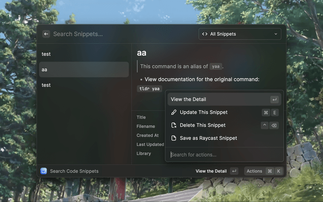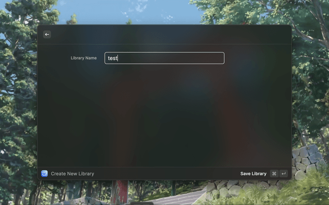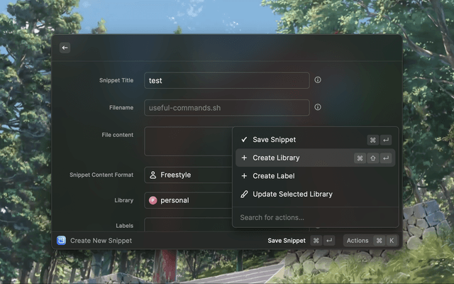 Open raycast - Create Code Snippet - Cmd + k - Create Library