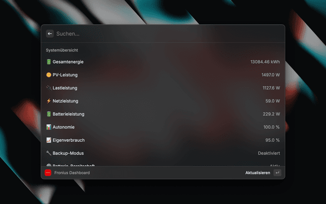 A Raycast extension to monitor your Fronius Gen24 inverter in realtime. This extension provides a unified dashboard that displays detailed inverter information and important system metrics. In addition, it includes a background menu‑bar command ("Inverter Watch") that continuously monitors for errors and allows you to quickly open the full dashboard.