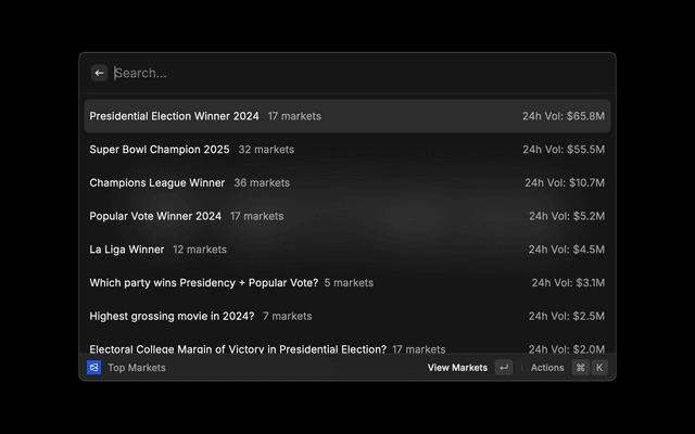 A Raycast extension for searching, viewing, and analyzing markets and trader profiles on Polymarket.com. View market prices, statistics, trader analytics, and trading data directly from Raycast.