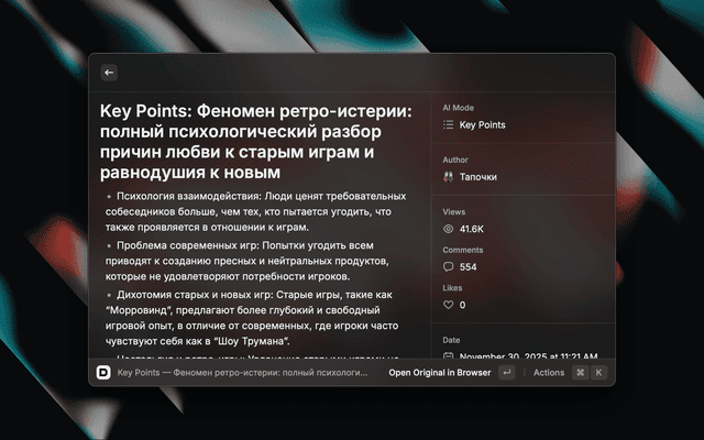 Ctrl + Shift + K | Key Points | Extract key points from the post |
