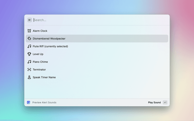 raycast/extensions repo, please ping me (@ThatNerdSquared) so that I don't miss your request!@ThatNerd(Squared)) if I have not responded to you in a timely manner.src/hooks/useTimers.ts contains the custom React hook that I use for state management across various commands, and timerUtils.ts contains backend functions I use to create the actual timer files.customTimers.json file as an array of CustomTimers, and running timers are stored as text files where the filename is [date and time started, with illegal characters replaced with __]---[length of timer in seconds] and the file content is a single line with the name of the timer.Sound effects procured royalty-free from Mixkit.
