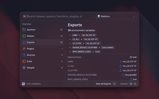| 📦 | Export Management | Manage environment variable exports with search by variable name or value |