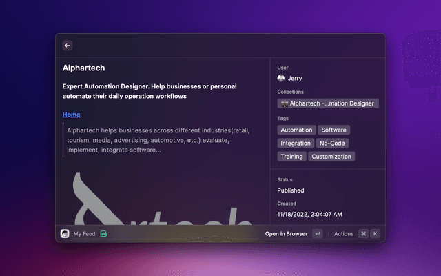 Integrate bookmarks from Brave, ChatGPT Atlas, Chrome, Dia, Edge, Firefox, Safari, Arc, Vivaldi, Vivaldi Snapshot, Zen, Whale, or Helium.