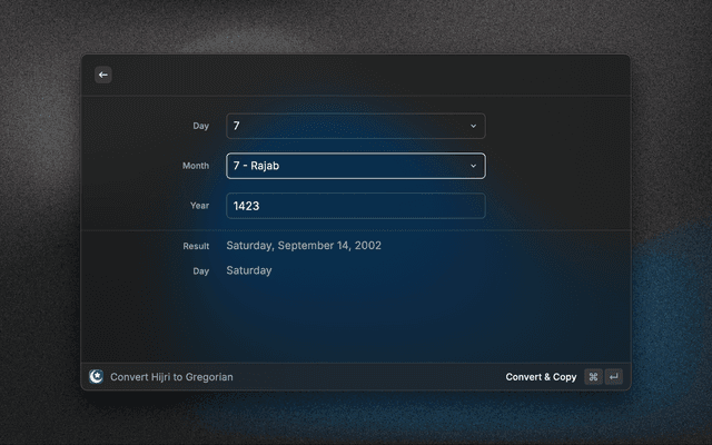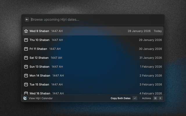 Convert dates between Hijri (Islamic) and Gregorian calendars directly from Raycast.