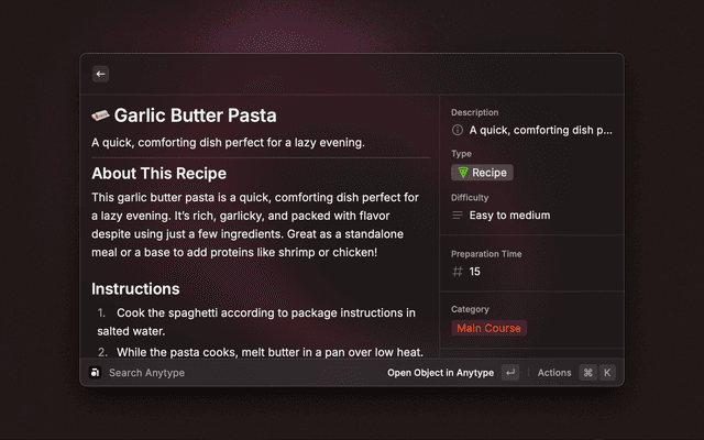 - Open: Use Command + Enter to instantly open the currently selected space or object in Anytype.