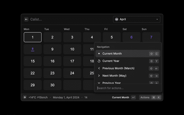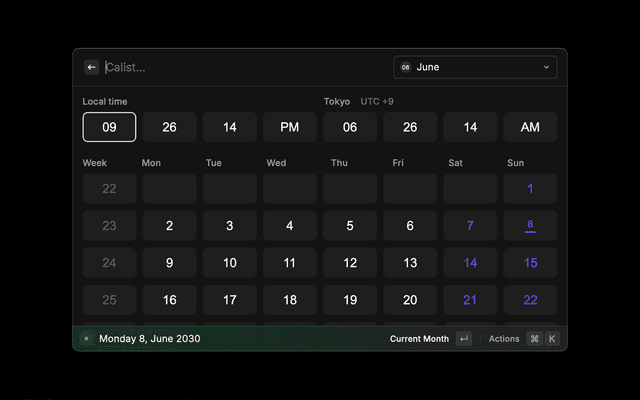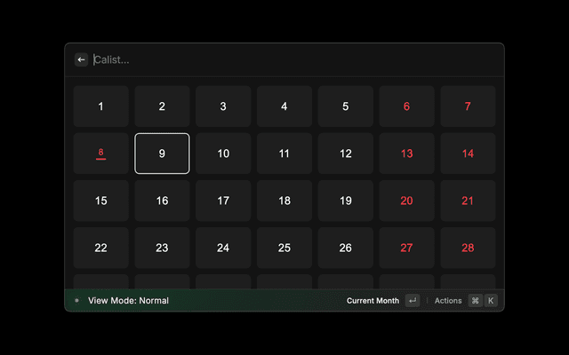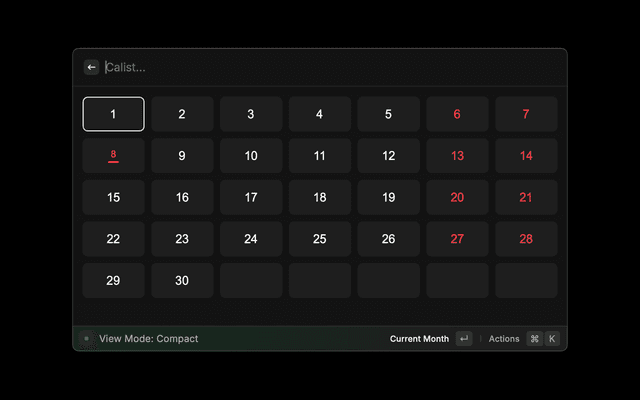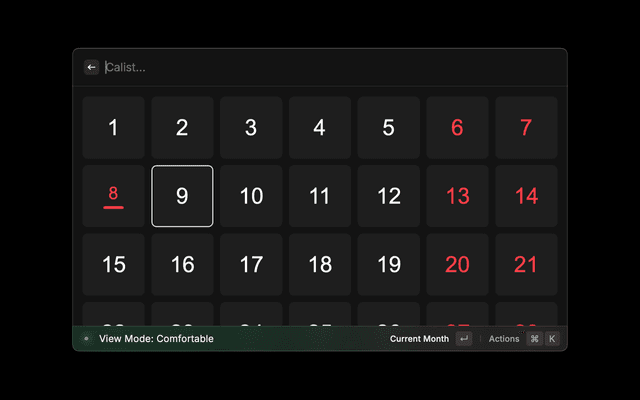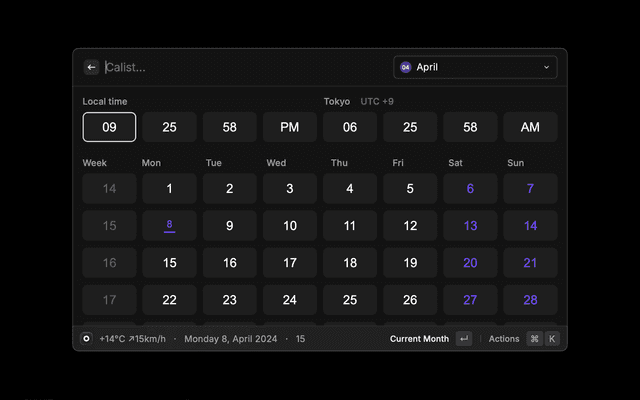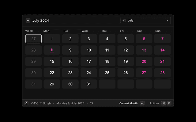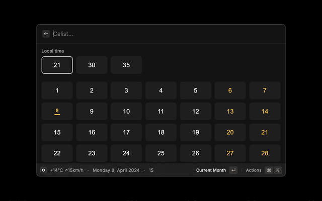 Customize the look and feel by using themes with colors built in Raycast, applies to current day, weekends and dropdown current month