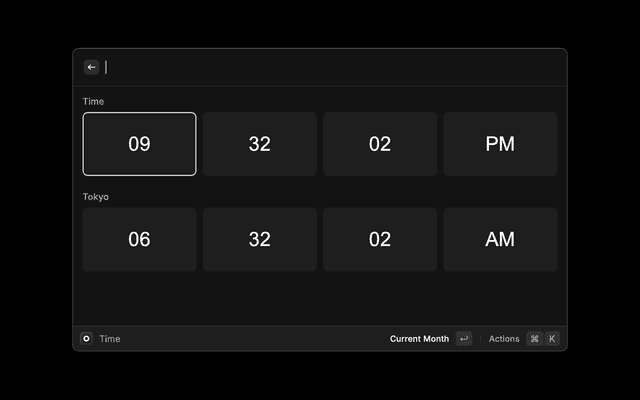 This extension consists of two commands, Calendar and Time. The Calendar command displays a calendar with the current date highlighted and very flexible navigation shortcuts. The Time command displays the current time and optional extra timezone. Both commands have a variety of settings that can be customized to your liking.
