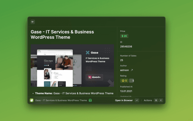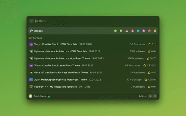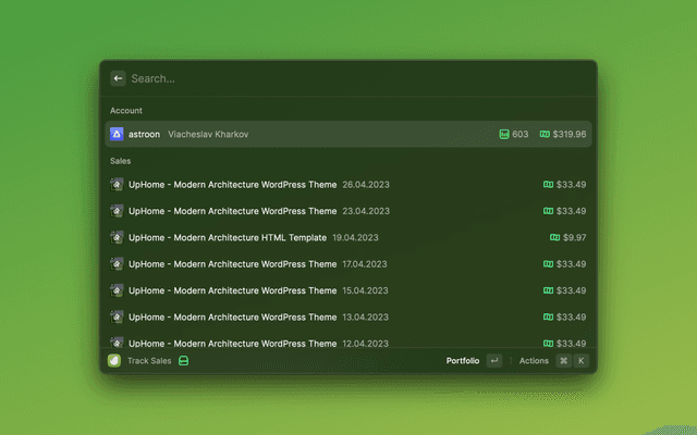 This is a Raycast extension for Envato. With this extension, you can view portfolio, verify purchases, track sales and view purchases.