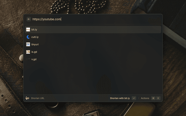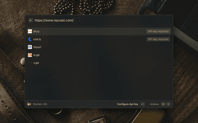 To use bit.ly or cutt.ly, add your key in Raycast: