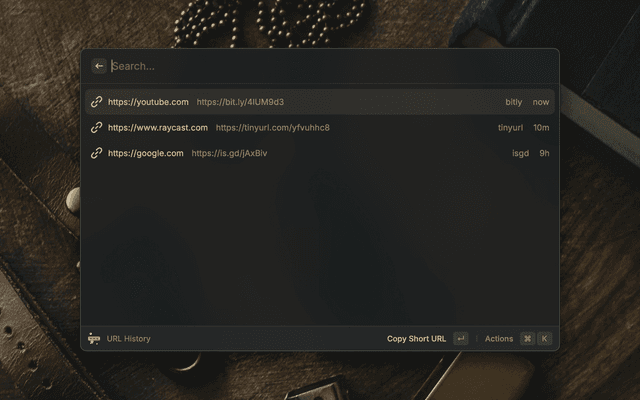 To retrieve a past result, run URL History. From any history entry you can copy the short URL, copy the original URL, open it in the browser, or delete the entry.