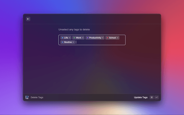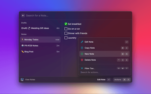 ⌘ + N - Create a new note⌘ + ⇧ + C - Copy note body^ + ⇧ + X - Delete a note⌘ + T - Quick apply / remove tag⌘ + ⇧ + T - Create a new tag⌘ + F - Filter by tag^ + ⇧ + T - Delete tags⌘ + M - Toggle note metadata⌘ + S - Sort notes⌘ + I - Summarize note with AI⌘ + ⇧ + I - Clear AI summaryCreate Note