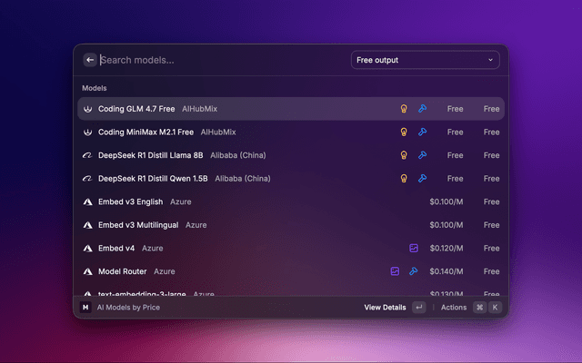 Select two models for side-by-side comparison. View pricing, context windows, and capabilities in a table. Export comparisons as markdown.