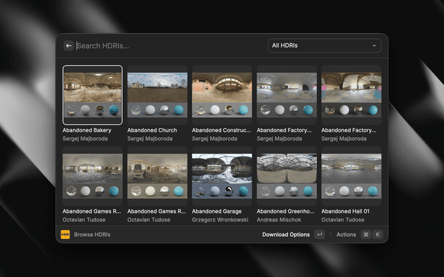 - Browse HDRIs: Search and browse the complete Poly Haven HDRI library with beautiful thumbnail previews