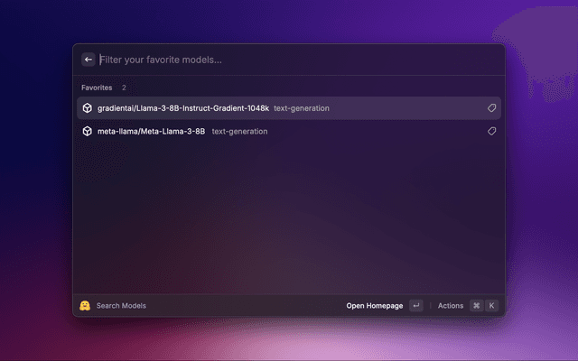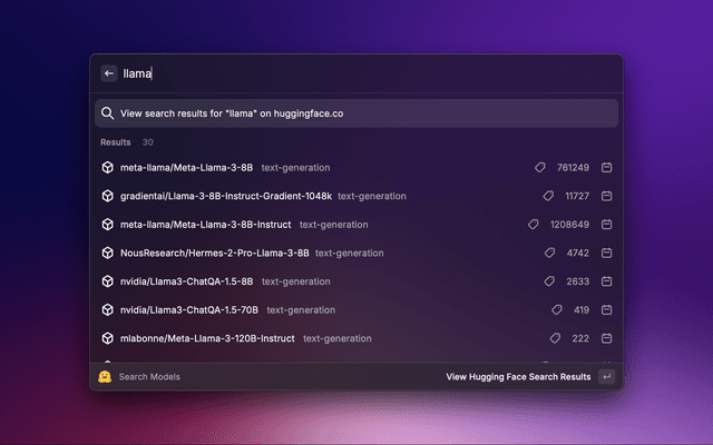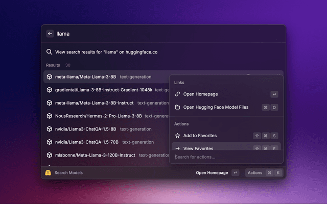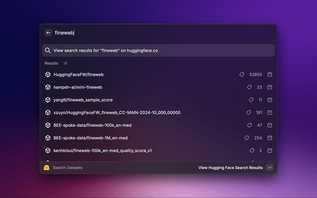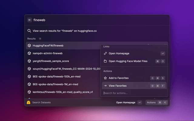 Raycast extension to search, favorite and keep history of Hugging Face datasets and models