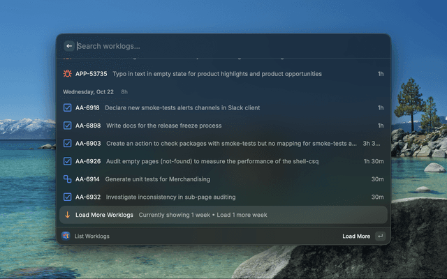 • List Worklogs: View recent work logs grouped by day with total hours