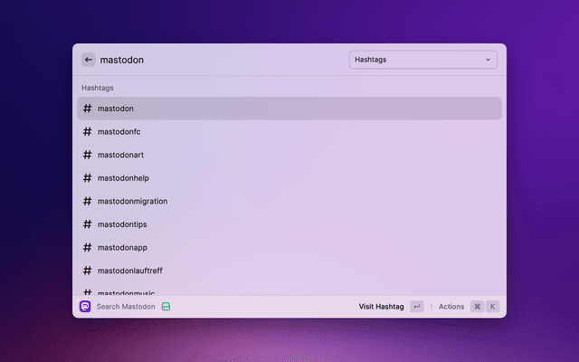 Search for people or hashtags on Mastodon! – This extension is not intended to be a full Mastodon client. Instead, it is a quick and easy way to get glanceable information about people and to navigate to pages on the Mastodon website. It intentionally does not include posting, browsing timelines, mentions, or even post search.