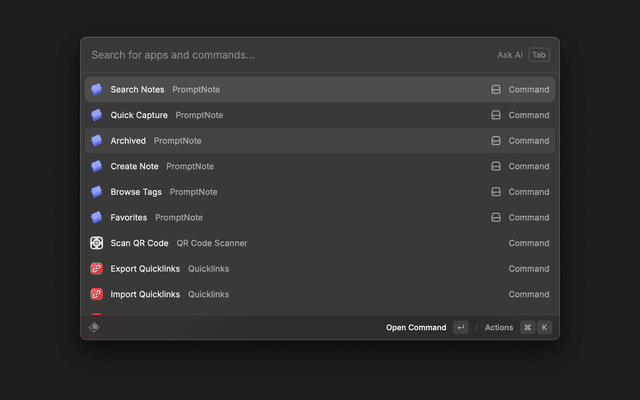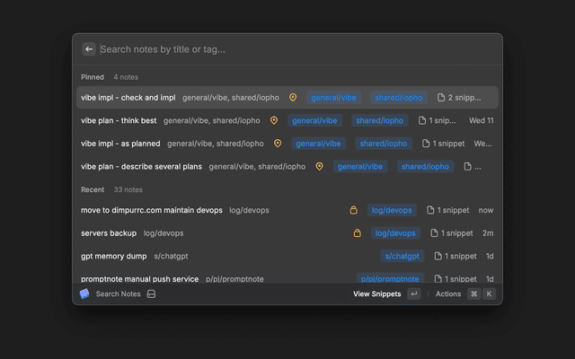 PromptNote lets you save, organize, and version your AI prompts and snippets. This extension brings your prompt library to Raycast for quick access, search, and capture.