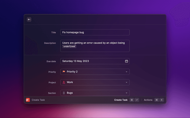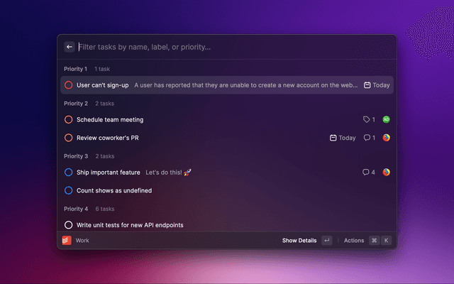 Home command and select your view in the dropdown (e.g All Tasks or a specific project)Create View Quicklink in the actions (⌘ + K).⌘ + ⏎).This makes it easy to access any of your views, including projects and labels!