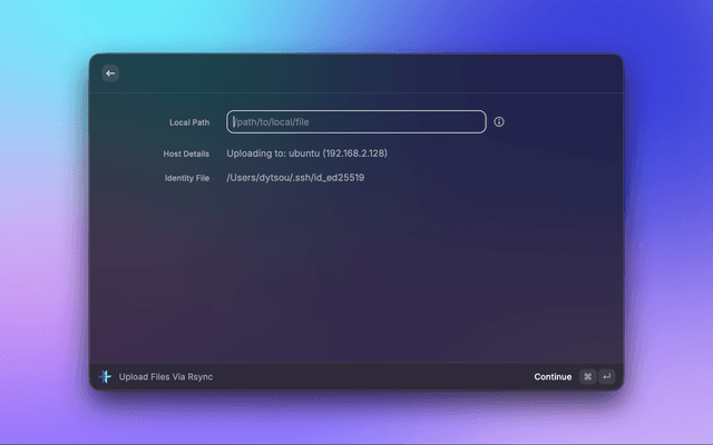 • Unit tests for utilities (SSH config parsing, validation, rsync command building)