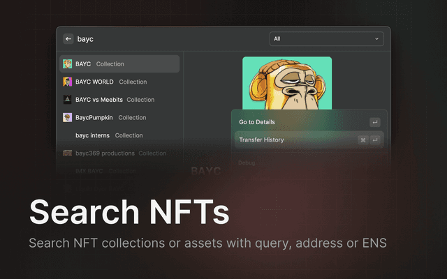 - See NFT collection details (metadata, tags, floor price, transfer history, etc.)
