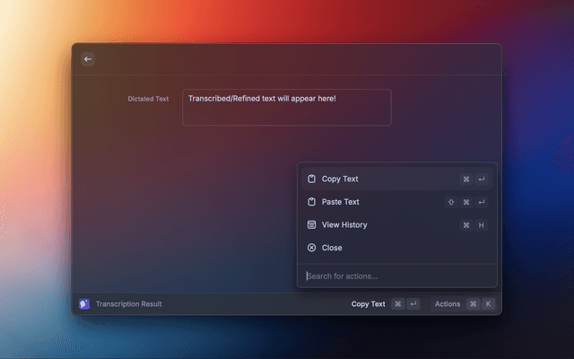 Enter when you are finished speaking.⌘ + . or click "Cancel Recording" to abort.whisper.cpp processes the audio. This may take a few seconds depending on the audio length and model size.Paste Text: Pastes the content.Copy Text (⌘ + Enter): Copies the content.PreferencesClose (Esc): Closes the Raycast window.Dictation History anytime you need a past transcription. It currently stores up to 100.