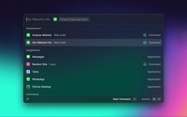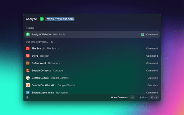 The command for starting the Extension is Analyze Website [https://raycast.com/]. You can use any URL you want, if it is not reachable or you don't type the URL in including a protocol, the extension will throw an error. You can press ⌘T to see some more information on how to fix the issues.