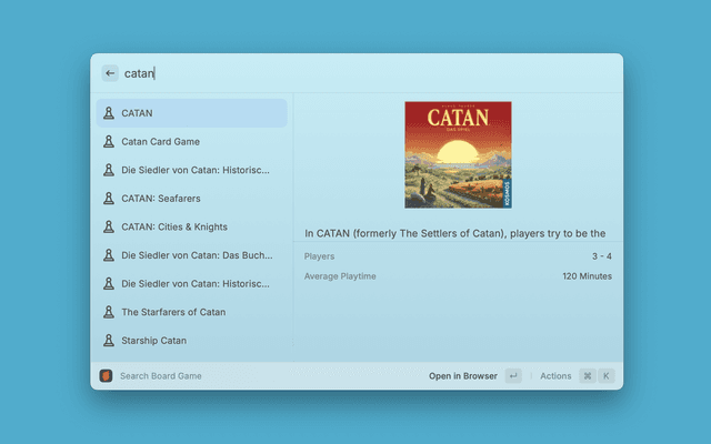 Search BoardGameGeek, and view information on your favorite board games, within Raycast.