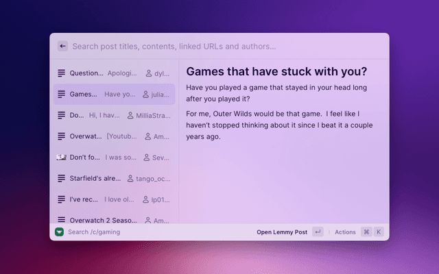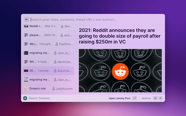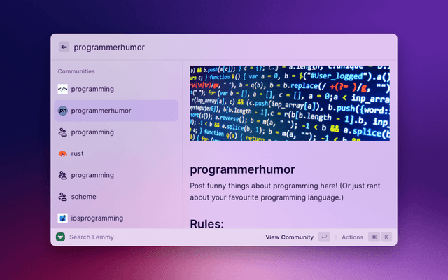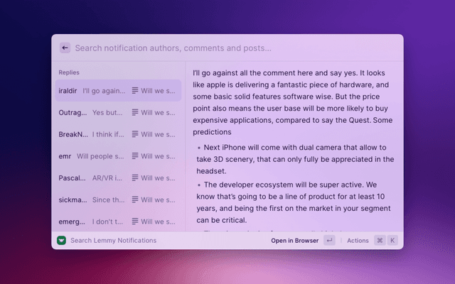 Lemmy for Raycast lets you lightly browse your Lemmy communities and notifications. View your timelines (All, Local, Subscribed), search for communities, users and posts, and stay up to date with your notifications, like replies and mentions.