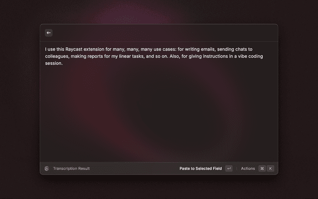 A powerful and easy-to-use extension for Raycast that converts voice to text using OpenAI's most advanced models, including GPT-4o-transcribe.
