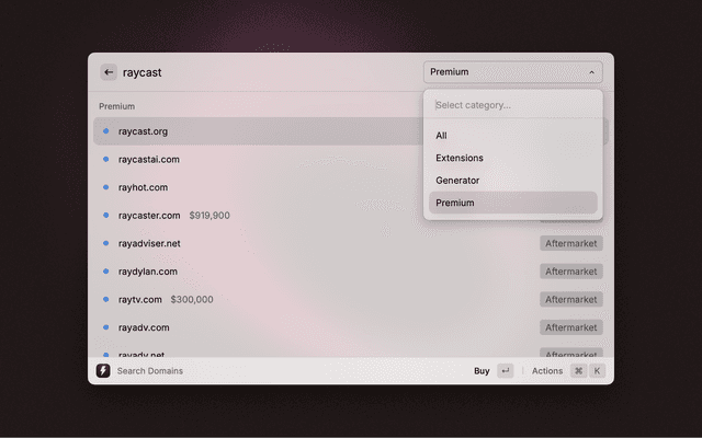 The fastest domain name search tool on the internet, now available as a Raycast extension. Search for available domain names instantly with real-time results powered by instantdomainsearch.com.
