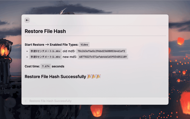 Modify Hash command is used to modify the hash of the selected file, Restore Hash command is used to restore them.Show MD5 Log can save time when there are large video files.Zip Compress command is used to encrypt and compress the selected file with zip, Zip Extract command is used to extract.
