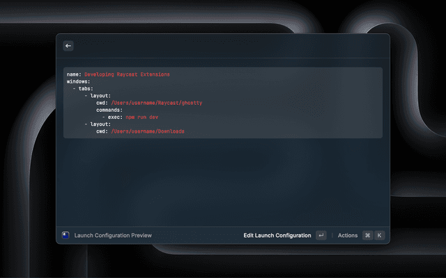 name required display name shown in Raycastwindows required list of Ghostty windows; each additional item opens in a new Ghostty windowwindows[].tabs required list of tabs inside that windowwindows[].tabs[].title optional tab title; if omitted, the extension uses the tab directory namewindows[].tabs[].layout required root pane for the tablayout.cwd optional working directory for that pane; supports ~layout.commands optional list of commands to run in the pane, in orderlayout.split_direction optional split direction for child panes: vertical opens to the right, horizontal opens downwardlayout.panes optional child panes; the first child merges into the current pane, later children are added as splitslayoutcommands on a pane are joined and executed in that panepanes[0] extends the current panepanes[1], panes[2], and so on create additional splitspanes let you build more complex layoutsname: Example Launch Configuration