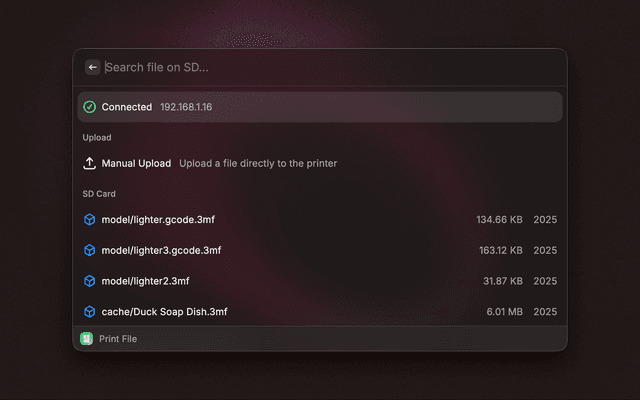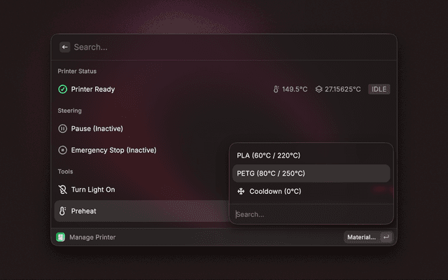 Bambu Lab Controller brings your 3D printer directly into Raycast. Manage your prints, control temperatures, and handle files instantly without breaking your workflow.