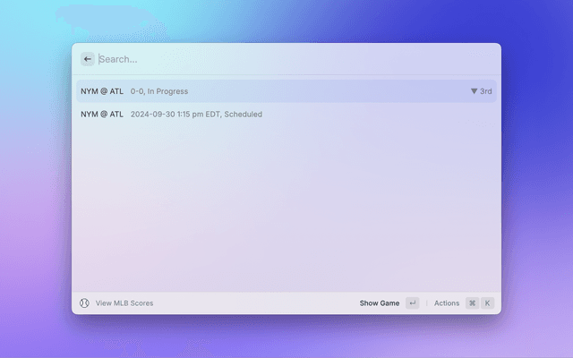 Browse up-to-date MLB standings grouped by league and division. See wins, losses, win percentage, and games back. You can choose which league (AL or NL) appears first via a command argument or preference.