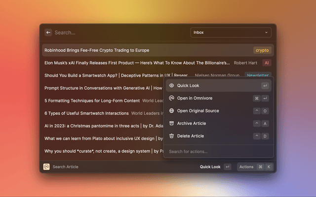 Welcome to the Omnivore Read-it-Later Extension! This extension provides convenient access to Omnivore's read-it-later features directly from your Raycast app.