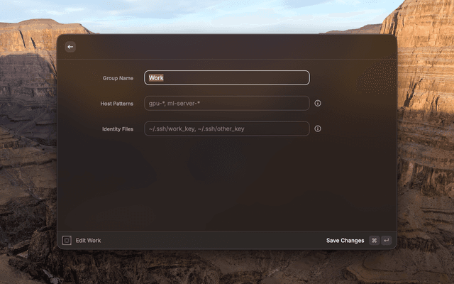 | Work Identity Files | SSH identity file paths (e.g. ~/.ssh/work_key). Hosts using these keys are classified as work |