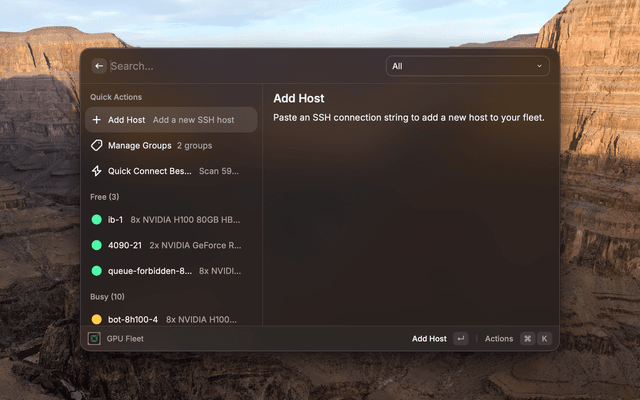 Monitor GPU and CPU usage across your SSH hosts directly from Raycast. See which machines are free, busy, or offline at a glance, then connect in one keystroke via your preferred terminal or editor.