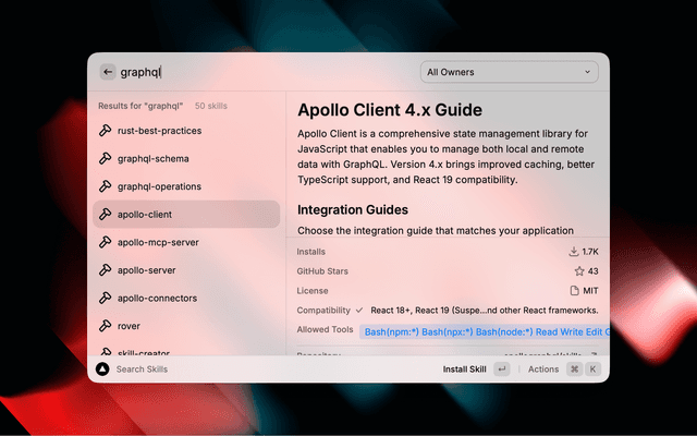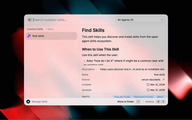 - View skill details inline with SKILL.md content, including description, license, compatibility, and allowed tools (toggle with Cmd+D)