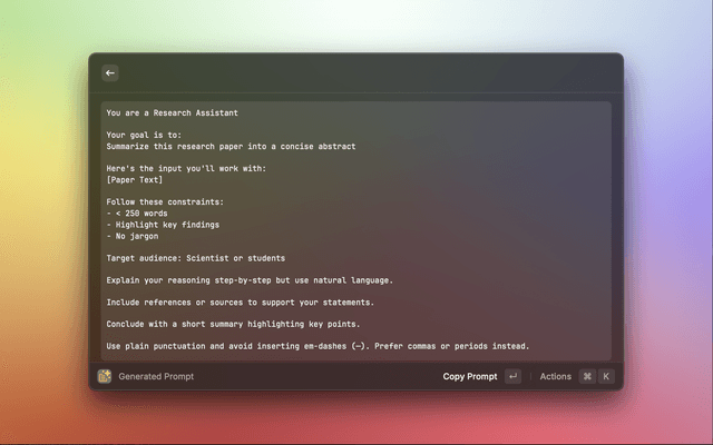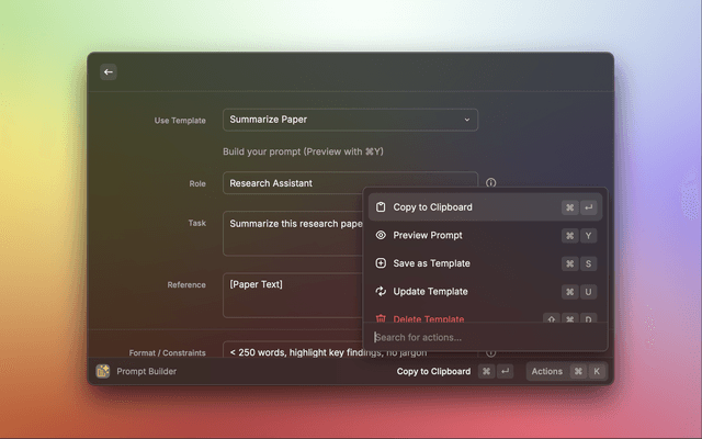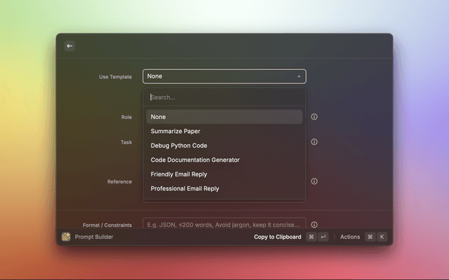 Prompt Builder is a Raycast extension that helps you craft the perfect AI prompts efficiently. It makes it easy to define roles, tasks, tone, audience, and constraints, helping make AI output more accurate and consistent. Build structured prompts with templates, preview them, and copy instantly to your clipboard.