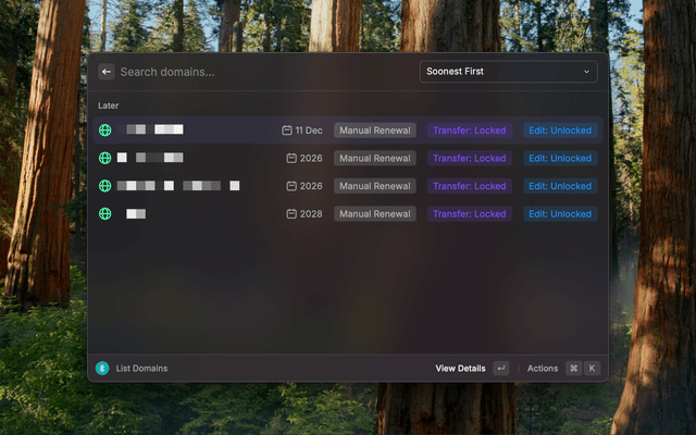 • List Domains: View all your domains with expiration dates, auto-renewal status, and domain lock status