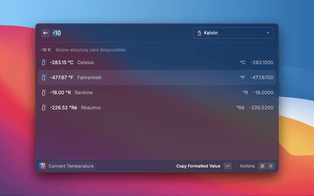 ⌘↵ - Copy formatted value (e.g., "77.00 °F")