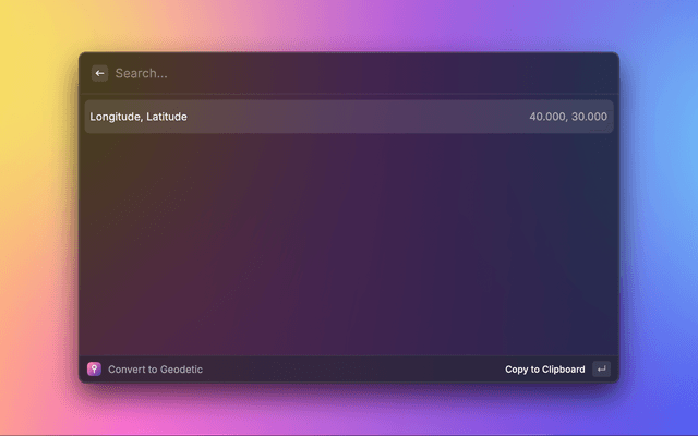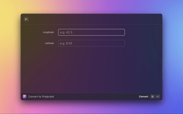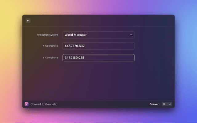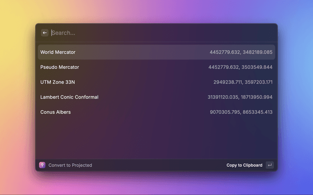 A Raycast extension for converting coordinates between geodetic (latitude/longitude) and projected coordinate systems.