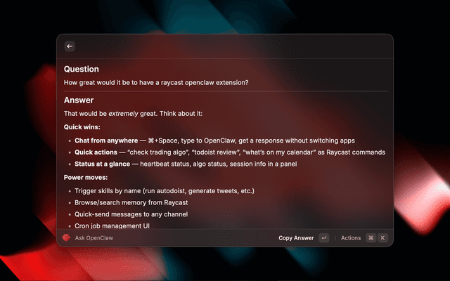 Chat with your local OpenClaw AI assistant directly from Raycast.