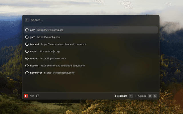 raycast-nrm can help you easy and fast switch between different npm registries, now include: npm, yarn, tencent, cnpm, taobao, npmMirror.