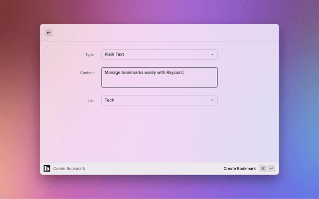 A user-friendly Raycast extension that seamlessly integrates with Karakeep (previously Hoarder), bringing powerful bookmark management to your fingertips. Quickly save, search, and organize your bookmarks, texts, and images—all through Raycast's intuitive interface.